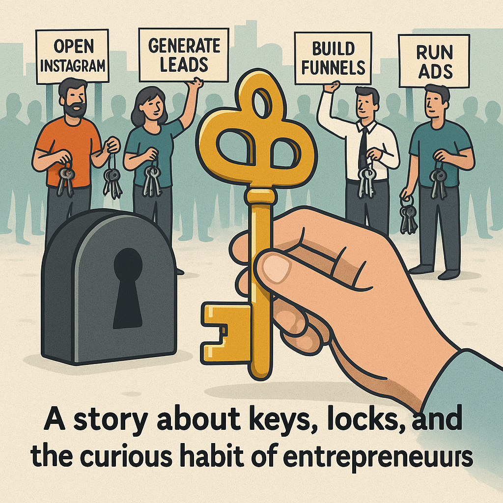 Stoją na nim dziesiątki, setki ludzi. Każdy z tabliczką: „Otwieram Instagram”, „Dostarczam leady”, „Buduję lejki”, „Robię reklamę”. Każdy trzyma w rękach pęk kluczy. I wszyscy przekrzykują się: „Chodź do mnie! Moje klucze są najbardziej uniwersalne! Zaraz przyprowadzę Ci klientów!” Podchodzisz do jednego z nich. — Masz klucz do mojego biznesu?